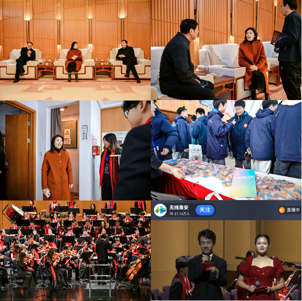 12月22日下午,“共振•和鸣 2026新年慈润淮安交响音乐会”在淮安市保利大剧院圆满落幕。本次活动由我校与江苏省淮阴中学联合主办,两校交响乐团联袂演绎,以高雅艺术为桥、慈善爱心为翼,奏响高高协同与公益担当的时代强音。中共淮安市委常委、宣传部部长李森,中共淮安市委常委、副市长董国喜,淮安市人民政府副市长封蕴珊,市慈善总会会长赵洪权等地方领导,我校党委副书记朱红及两校相关负责人观看演出。音乐会由淮阴中学2021届毕业生、我校大四学生何明瑞与淮阴中学高一学生宋明瑾主持,线上线下超20万人次同步观演。