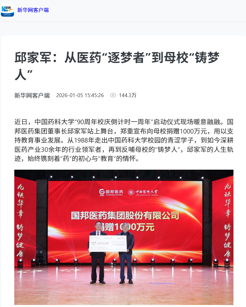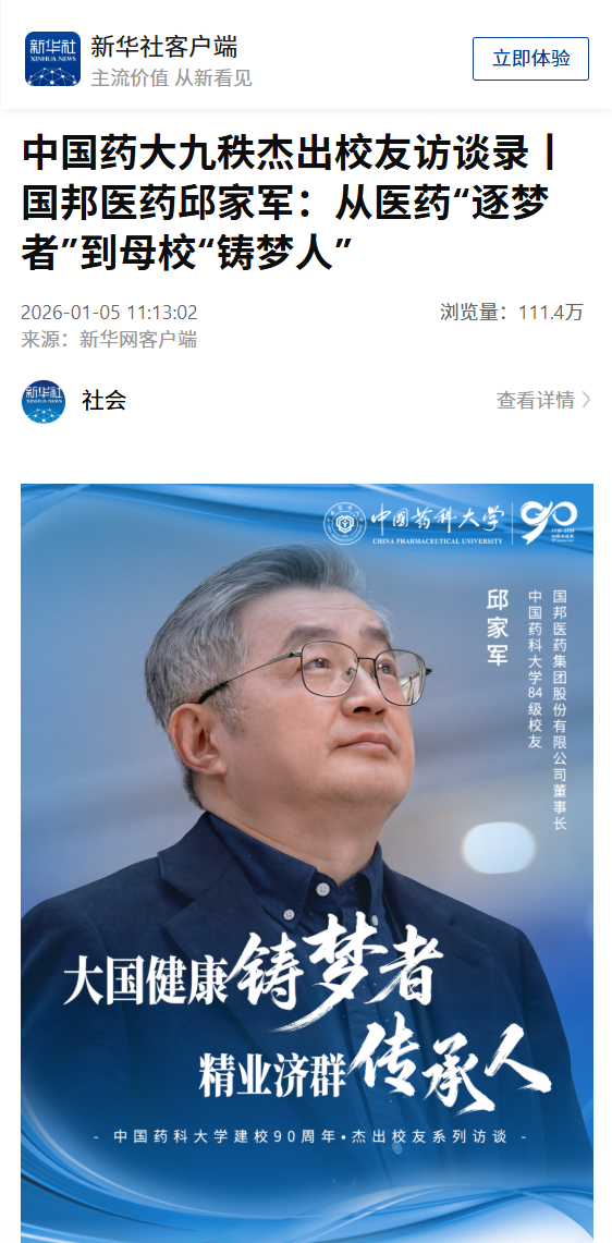 近日,新华社、新华网等中央主流媒体刊发国邦医药集团董事长、我校1984级校友邱家军先生的深度报道。截至目前,全网累计阅读量超过580万人次。