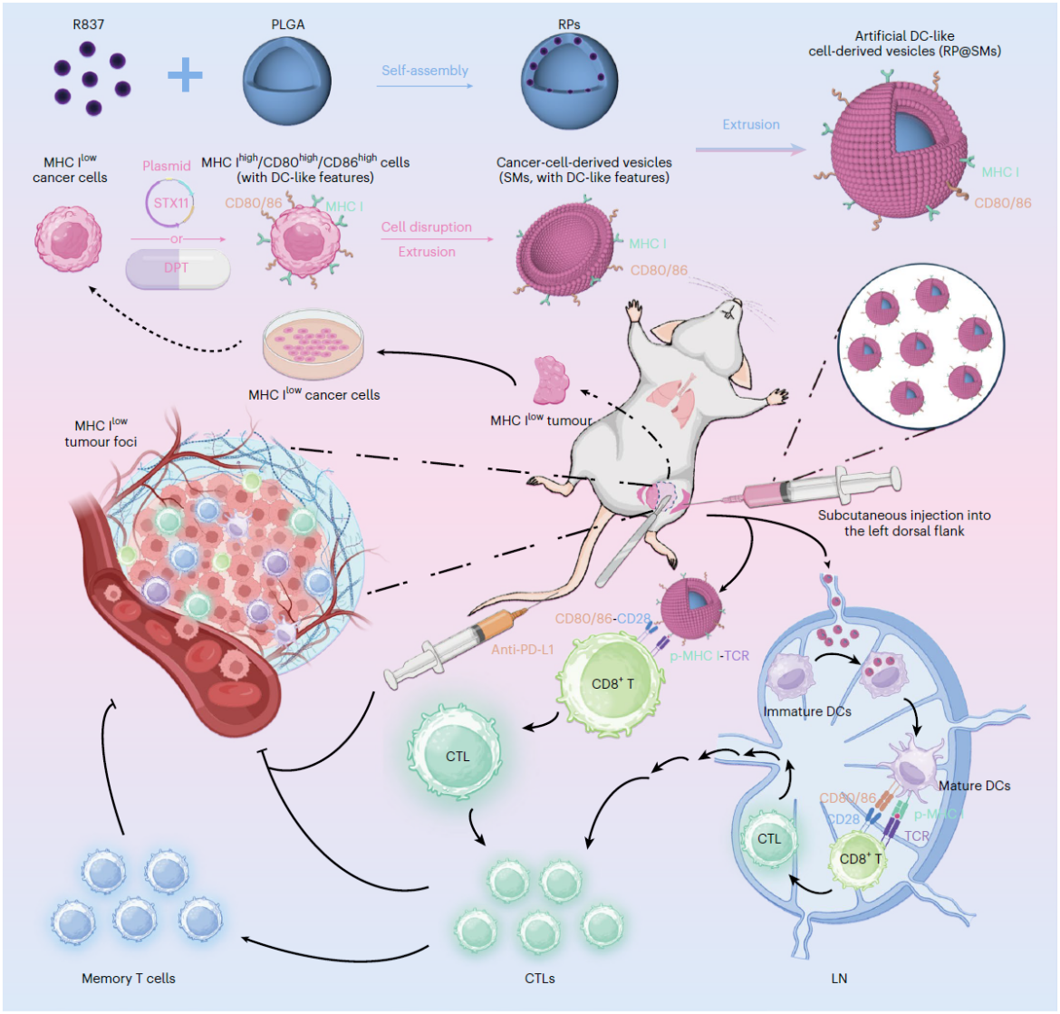 围绕这一关键科学问题,孔令义教授团队基于近年来在肿瘤囊泡(包括外泌体及人工囊泡)领域的系统研究积累(Journal of Controlled Release, 2025;Molecular Cancer, 2024;Acta Pharmaceutica Sinica B, 2024;Pharmacological Research, 2024),提出了一条全新的技术路线:直接将手术切除获得的自体肿瘤细胞重编程为具有抗原呈递功能的DC样细胞,从源头构建个性化疫苗载体。研究发现,肿瘤细胞中低表达、而在免疫细胞(尤其是DC)中高表达的关键分子STX11,能够显著上调肿瘤细胞膜上的MHC I及共刺激分子CD80/CD86。通过诱导STX11过表达,研究团队成功获得了MHC Ihigh/CD80high/CD86high的DC样肿瘤细胞,并利用其细胞膜构建人工DC样细胞来源的囊泡疫苗。该策略在完整保留患者特异性肿瘤抗原库的同时,引入明确的免疫共刺激信号,实现了抗原限制性的CD8+ T细胞激活,并在多种术后转移模型中表现出显著的抗肿瘤效果(图1)。