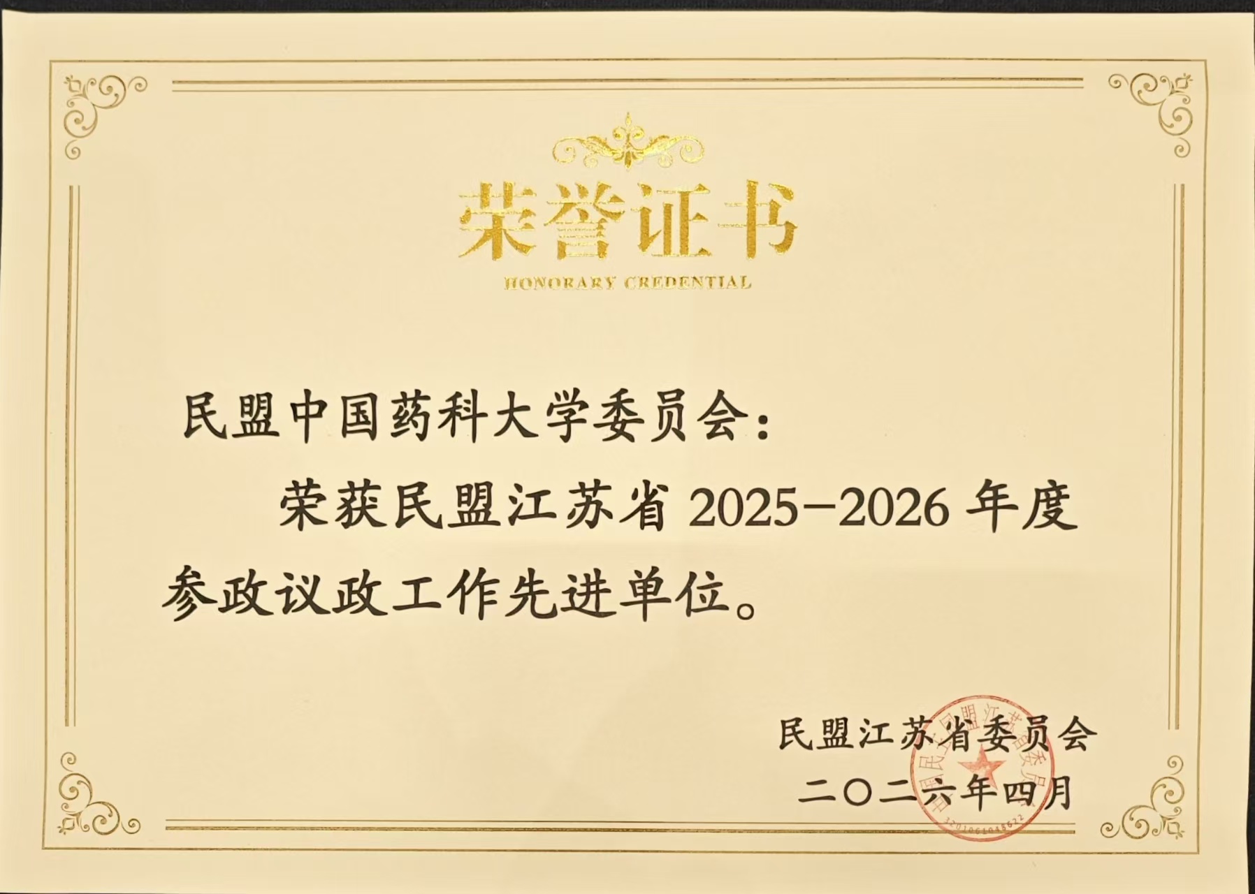 近日,民盟江苏省委对全省基层组织进行表彰,我校民盟委员会荣获“民盟江苏省2025-2026年度参政议政工作先进单位”荣誉称号(第一类)。