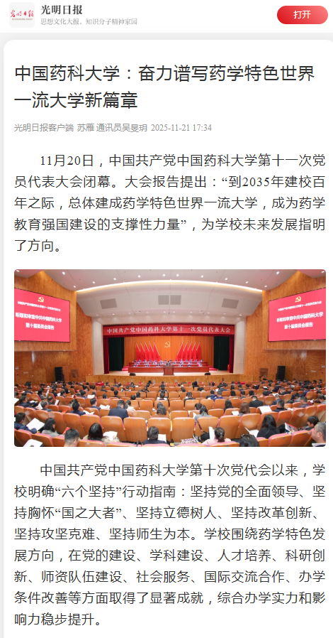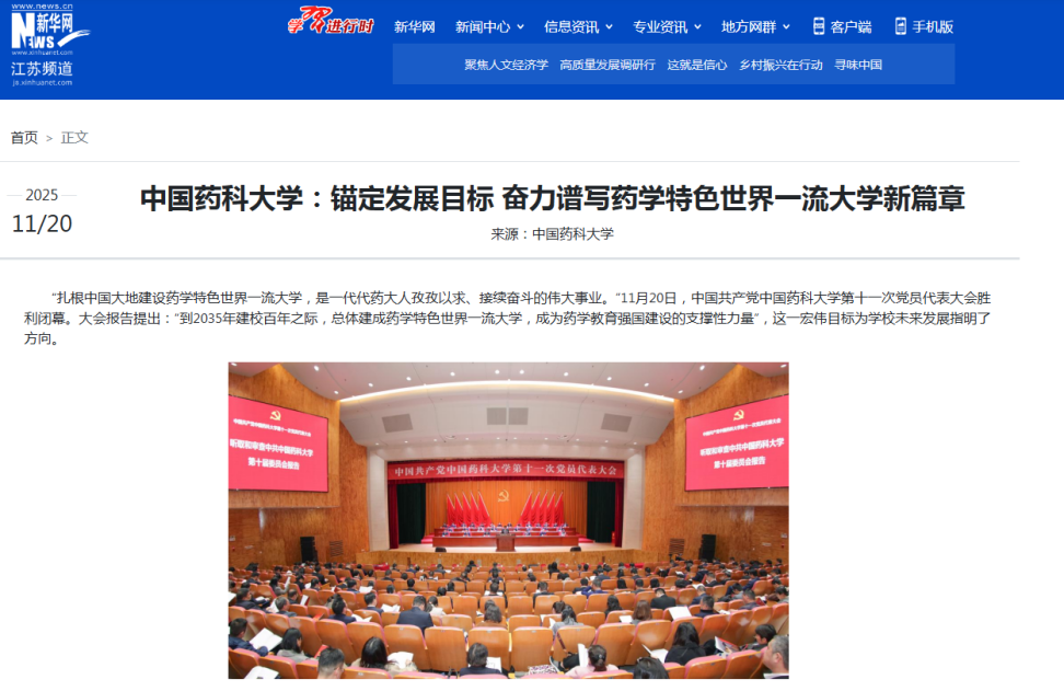 11月20日,中国共产党中国药科大学第十一次党员代表大会胜利闭幕。大会全面总结了第十次党代会以来学校改革发展进程中取得的工作成就、积累的宝贵经验,科学分析了学校当前面临的机遇与挑战,科学谋划了未来发展蓝图。会议期间,学校奋力谱写药学特色世界一流大学新篇章的创新实践获得新华社、光明日报等中央主流媒体的广泛关注。