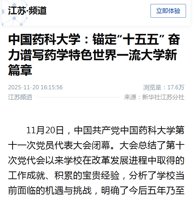 “我们将按照党的二十届四中全会总体部署,深入贯彻落实党中央关于教育科技人才‘三位一体’的战略部署,团结带领全校师生员工,回答好‘强国建设,药大何为’时代课题,高质量实现中国药大百年奋斗目标,为教育强国、健康中国建设贡献力量。”中国药科大学党委书记戴建君说,学校将统筹教育及科技人才建设,全面增强自主创新能力,加快高水平科技自立自强,引领发展生物医药新质生产力,更好地服务教育强国与健康中国建设。