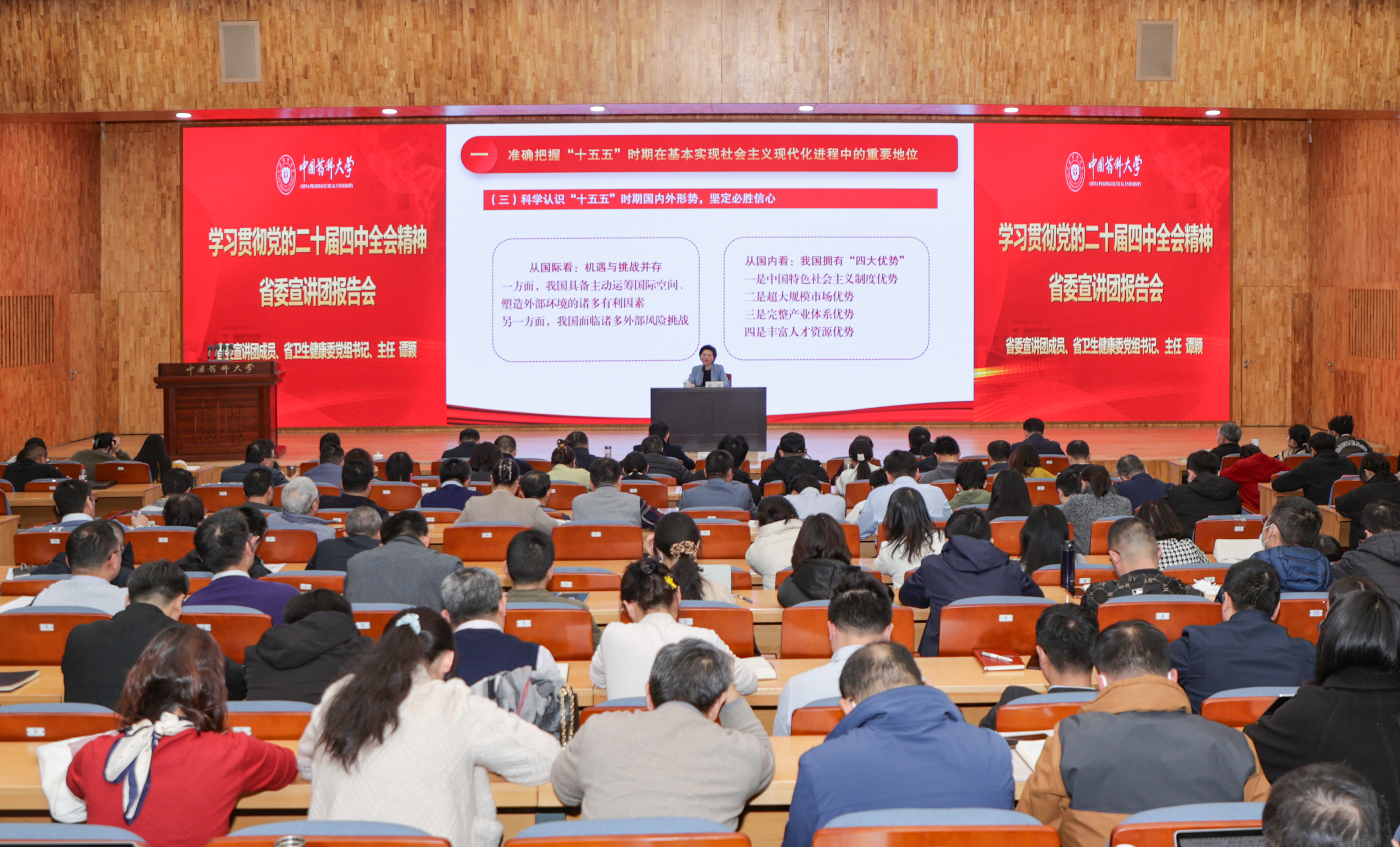 戴建君在主持讲话中指出,深入学习宣传贯彻党的二十届四中全会精神是学校当前和今后一个时期的重大政治任务。他强调,一是要进一步提高政治站位,在“学深悟透”上下功夫。要以此次省委宣讲团宣讲为契机,做到原汁原味学、融会贯通学、联系实际学,切实把思想和行动统一到全会决策部署上来,把学习贯彻全会精神转化为干事创业、开拓进取的生动实践。二是要进一步深化宣传阐释,在“立德树人”上见实效,推动全会精神深入人心汇聚奋进力量。要将学习贯彻全会精神与落实立德树人的根本任务紧密结合,坚持不懈用习近平新时代中国特色社会主义思想铸魂育人。要组织开展接地气、聚人气、有生气、冒热气的基层宣讲,统筹各方力量对全会精神进行全方位宣传、多角度报道、深层次解读,营造浓郁的宣传教育氛围。三是要进一步注重工作实效,在“推动发展”上求突破,科学编制学校“十五五”规划,一体推进教育科技人才“三位一体”协同发展。要把深入学习贯彻全会精神与贯彻落实学校第十一次党代会精神、高标准制定我校“十五五”规划紧密结合起来,围绕建成药学特色世界一流大学目标任务,聚焦生物医药领域创新,赋能新质生产力发展,一体推进教育科技人才“三位一体”协同发展,确保各项部署落地落实、取得实效,共同谱写学校高质量发展崭新篇章。