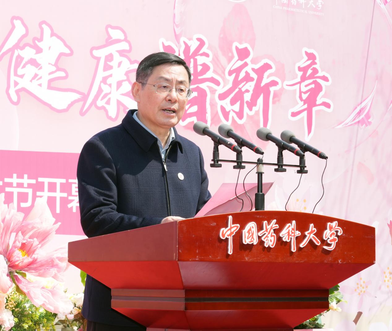 戴建君代表学校向长期以来始终关心、大力支持学校发展的师生校友们致以崇高的敬意和衷心的感谢。他表示,回望办学历程,学校取得的每一项成绩,都凝结着一代代中国药大人的智慧和汗水,离不开广大校友始终如一的关心与支持。他指出,今年11月16日,学校将迎来九十周年华诞。九秩芳华,镌刻着筚路蓝缕、以启山林的创业艰辛,更是奏响矢志药学、服务健康中国的时代强音。希望全体药大人以文化艺术节开幕式为契机,进一步繁荣校园文化,以文化人、以文育人,让广大师生在文化的浸润中涵养品格、砥砺志向、厚植情怀。他强调,学校将持续深化与校友的联络互动,汇聚各方智慧和力量,凝聚起推动学校高质量发展的强大合力,共同谱写中国药科大学服务健康中国更加辉煌的新篇章。